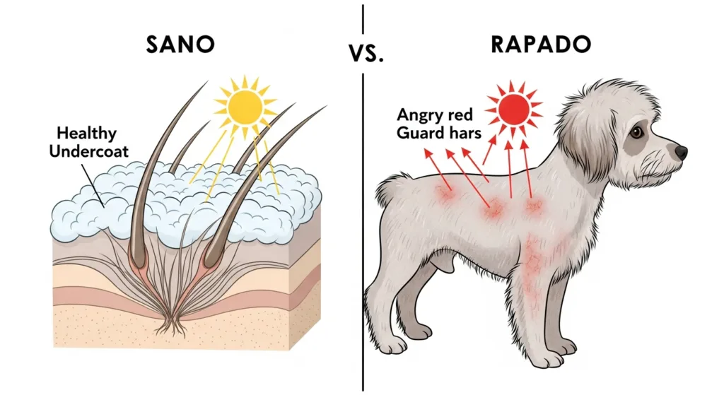 El pelaje de los perros doble capa es un aislante térmico natural. En verano, el subpelo atrapa aire fresco cerca de la piel, creando una barrera contra el calor. Al cortarlo, se elimina esta «cámara de aire» protectora, exponiendo la piel directamente a las altas temperaturas y los rayos UV.