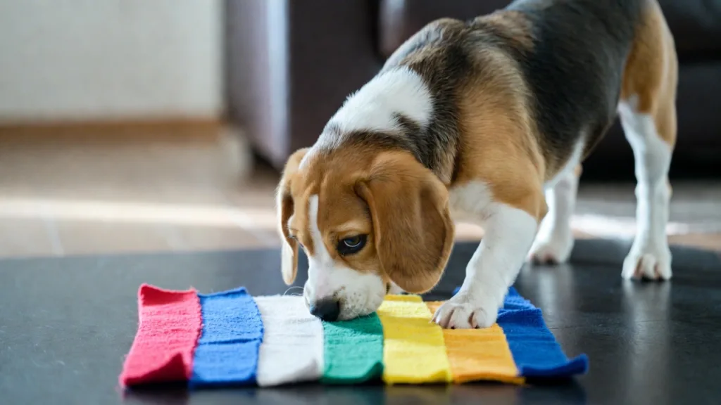 Para maximizar el enriquecimiento ambiental para perros, varía los juegos. Un día usa la alfombra de olfato, otro día esconde premios por todo el jardín («sembrado»), y otro practica la discriminación con cajas.